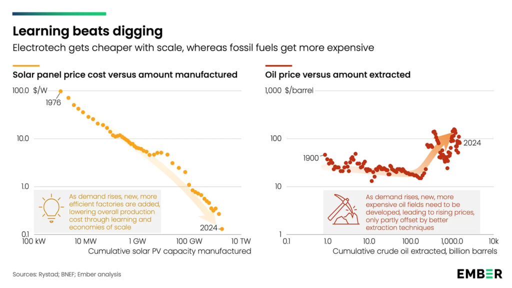 När efterfrågan på solpaneler ökar byggs fler fabriker som producerar mer effektivt, vilket sänker kostnaderna. Priset på solpaneler har minskat med 99 procent sedan 1980, vindkraft med 80 procent och batterier med 99 procent. Fossila bränslen fungerar tvärtom – när efterfrågan ökar måste dyrare källor utvecklas, vilket driver upp priserna.