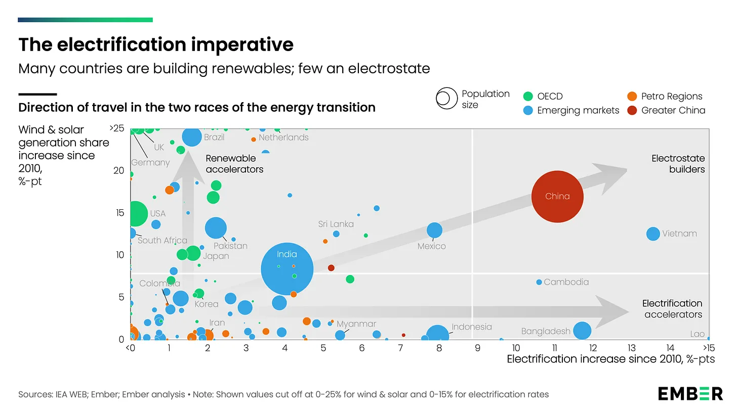 2023 hade tillväxtmarknader kommit 63 procent längre än USA i solenergiutbyggnad. Länder som Vietnam, Chile och Indien bygger solenergi snabbare än USA gjorde tidigare. ASEAN-länderna passerade USA i elektrifiering 2023.