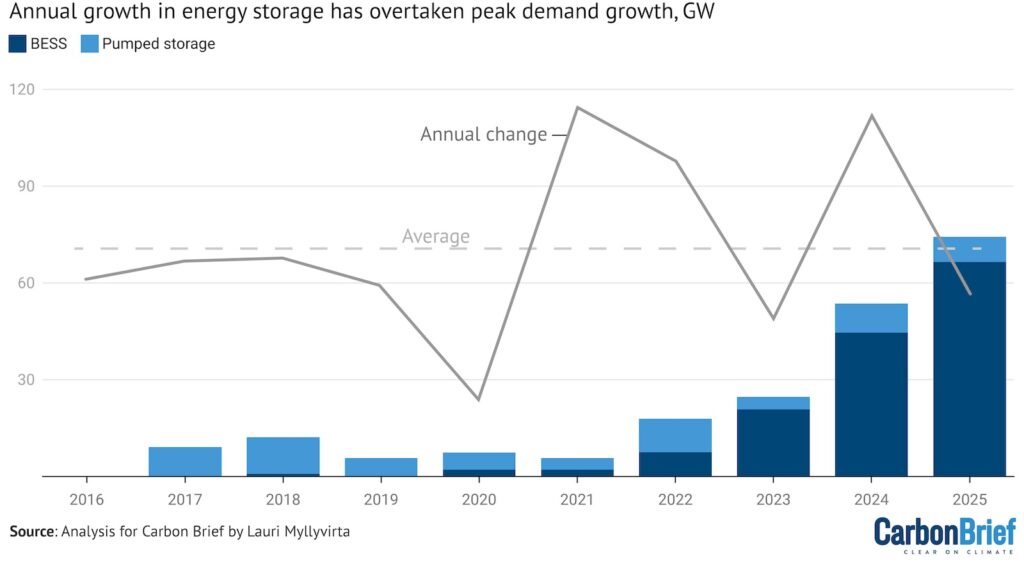 2025 markerade också en annan vändpunkt. För första gången växte kapaciteten för energilager snabbare än topplasten i elnätet. Medan topplasten bara ökade med 55 miljarder watt, växte lagringskapaciteten med 75 miljarder watt – främst i form av batterier.