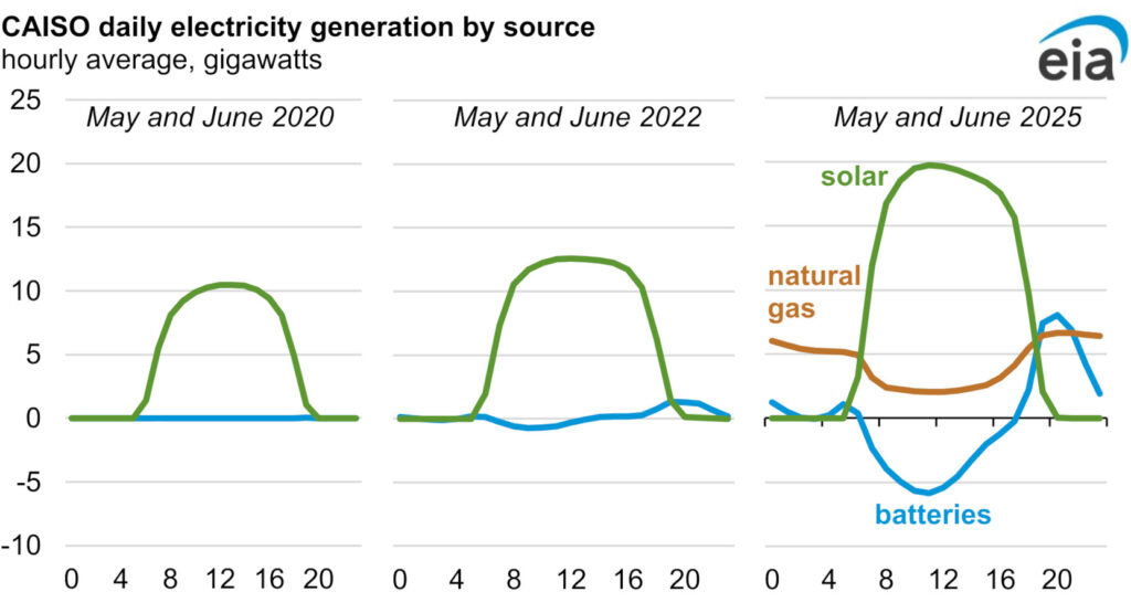 Solenergin växer samtidigt som batterier täcker kvällstopparna. Under maj och juni ökade solenergiproduktionen mitt på dagen från 10 miljarder watt 2020 till 19 miljarder watt 2025, enligt California Independent System Operator. Mellan klockan 17 och 21, när människor kommer hem från arbetet och elanvändningen stiger, kunde batterilager släppa ut knappt 5 miljarder watt elektricitet 2025. Det är en ökning från under 1 miljard watt 2022.