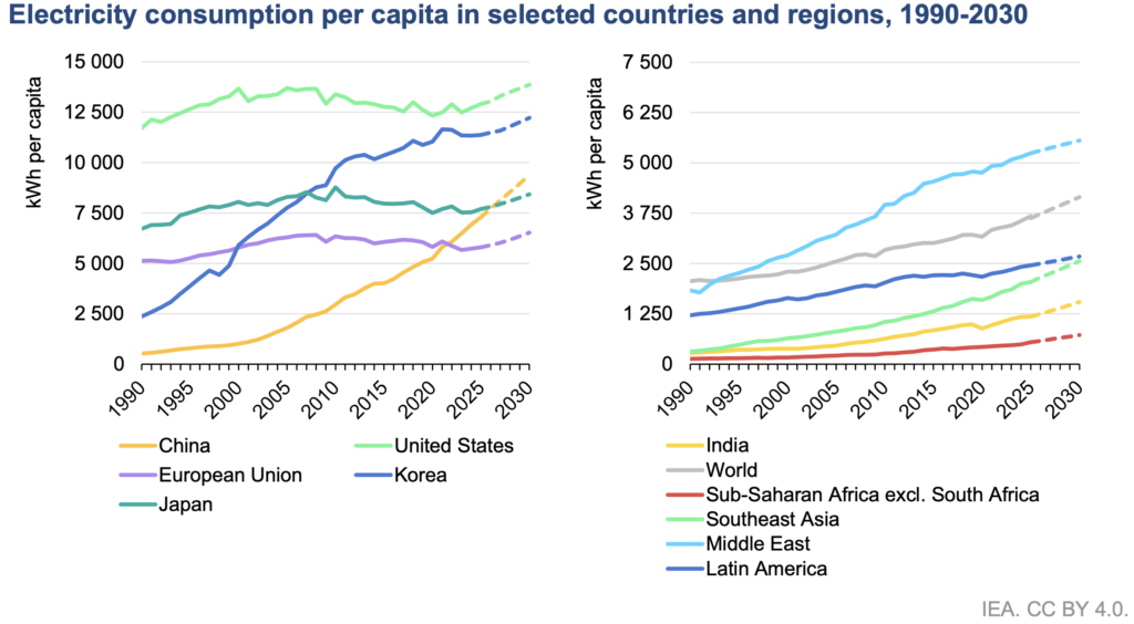 I rika länder ökar elanvändningen igen efter 15 år av stagnation. I USA steg användningen med 2,1 procent under 2025, och ungefär hälften av ökningen de kommande åren väntas komma från datacenters. EU:s elanvändning ökade med under en procent 2025 men väntas stiga med omkring 2 procent per år fram till 2030.