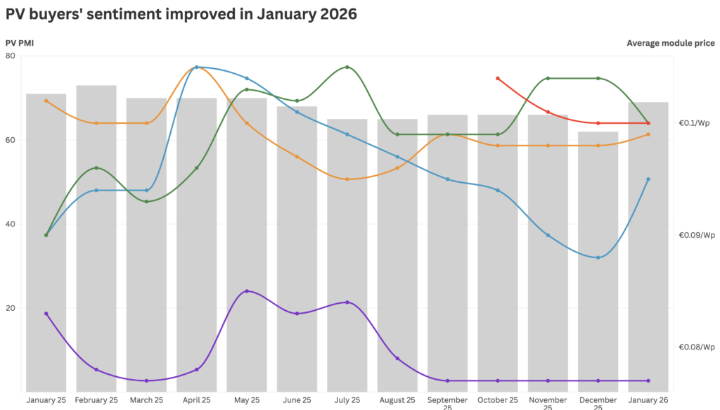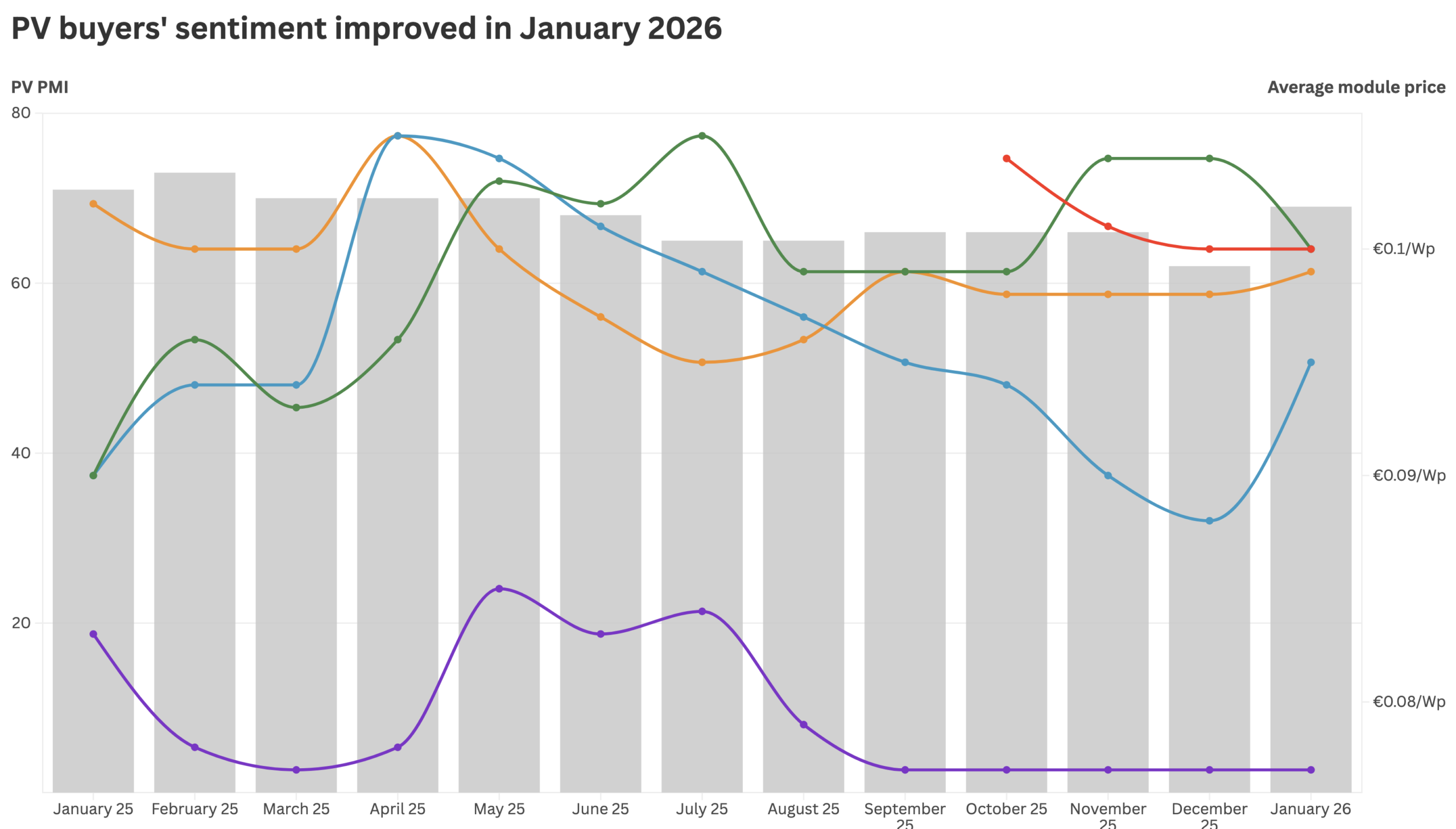 Det framgår av marknadsrapporten pv.index från plattformen sun.store, som varje månad mäter priser och stämningsläge bland solenergikunder i Europa. Det så kallade PV PMI-indexet – ett mått på optimism i branschen – landade på 69 i januari, upp från rekordlåga 62 i december 2025.