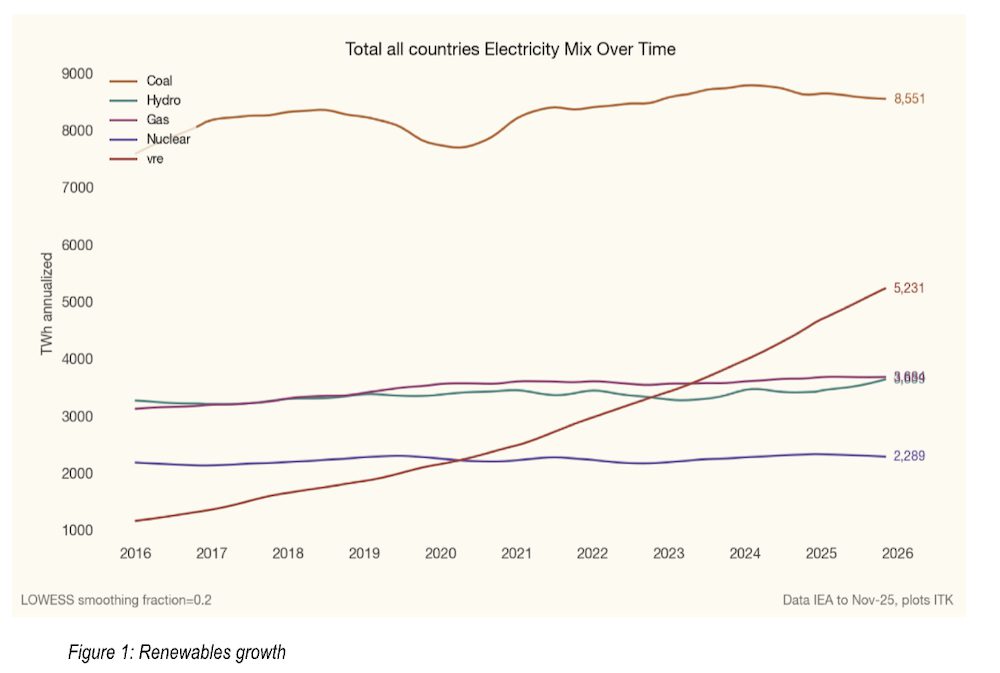 Sedan 2016 har den globala elproduktionen ökat från 18 till 23 miljoner miljarder wattimmar per år. Av den ökningen – 5,5 miljoner miljarder wattimmar – kom 3,9 miljoner miljarder wattimmar från solenergi och vindkraft. Det är mer än hela den kombinerade ökningen från gas, vattenkraft och kärnkraft tillsammans.