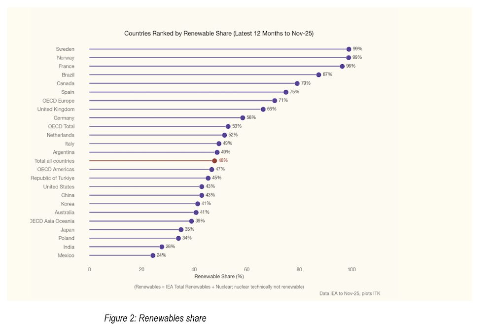Denna utveckling sker i alla länder, inte bara några få. Diagrammet över förändrad andel fri energi sedan 2016 visar att varje land i IEA:s databas har ökat sin andel solenergi och vindkraft. Nederländerna ökade mest med 34 procentenheter, Australien med 27 och Tyskland med 26. Sverige ökade med 16 procentenheter och ligger i dag på 99 procent andel fri energi inklusive kärnkraft.