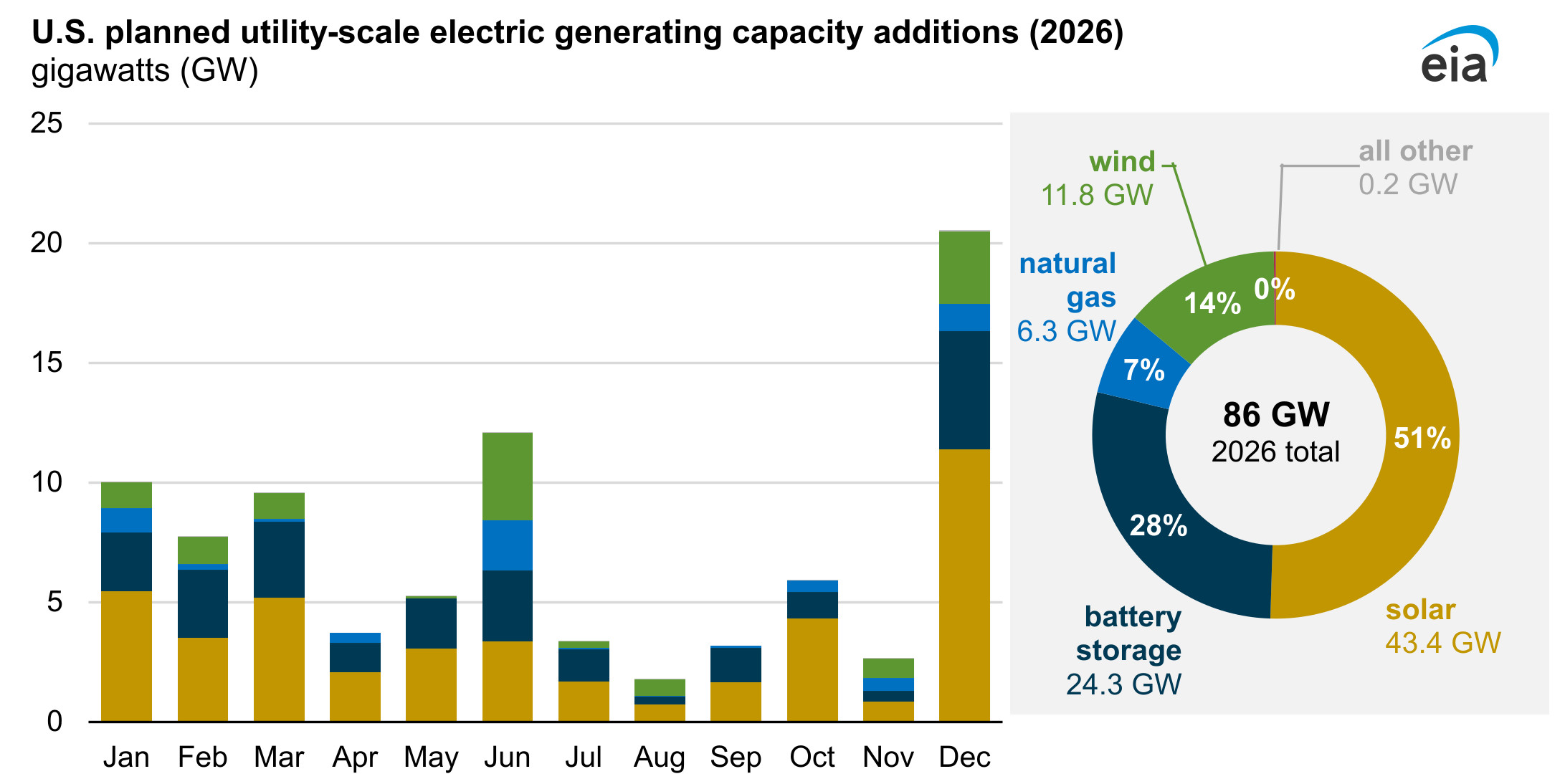 Utvecklare planerar att koppla in 43 miljarder watt ny solenergi, en ökning med 60 procent jämfört med förra årets 27 miljarder watt. Det är i samma storleksordning som rekordåret 2024, då 31 miljarder watt kopplades in. Mer än hälften av de nya solenergianläggningarna byggs i fyra delstater: Texas etablerar 40 procent, följt av Arizona, Kalifornien och Michigan. Det enskilt största projektet, Tehuacana Creek 1 i Texas, omfattar 837 miljoner watt solenergi och 418 miljoner watt batterilagring.