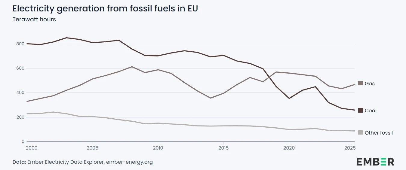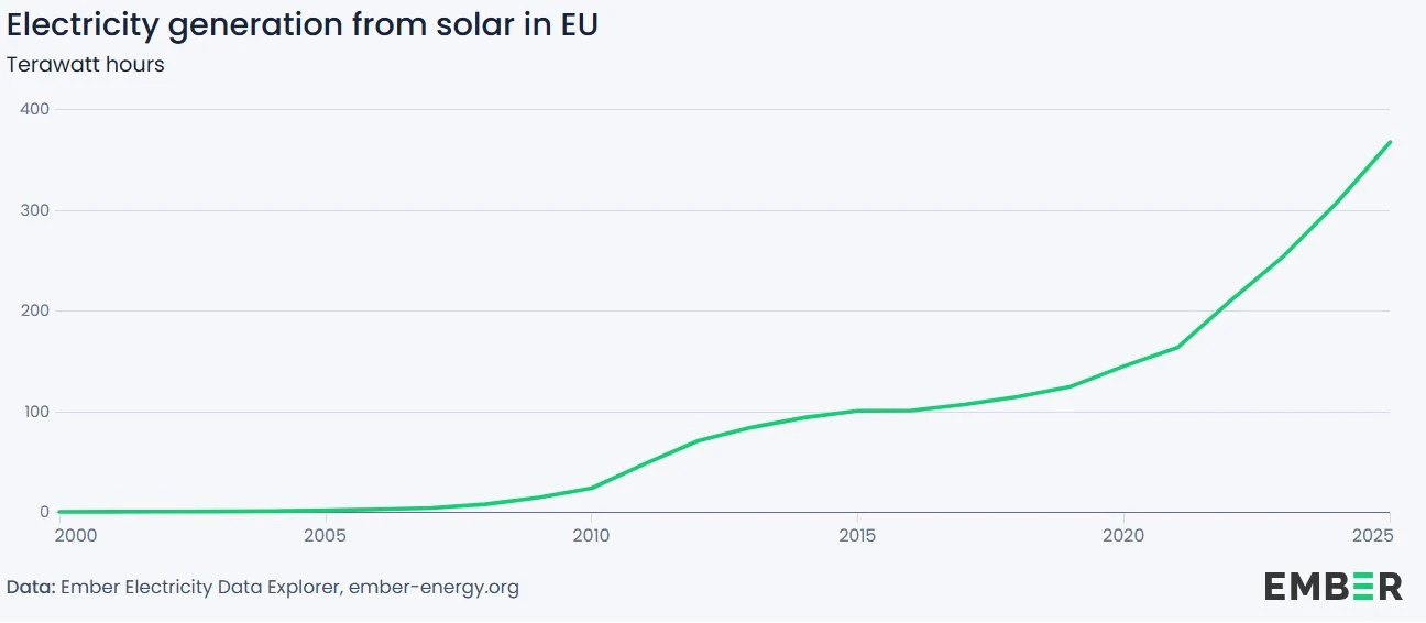 Kolökningen var kortvarig, solenergins ökning var bestående. Data från Ember visar att elproduktionen från kol i EU sjönk från runt 850 tusen miljarder wattimmar runt 2007 till cirka 250 tusen miljarder wattimmar 2025 – och den tillfälliga kolökningen 2021–2022 syns knappt i den långsiktiga trenden. Under samma period steg elproduktionen från solenergi i EU från nära noll till ungefär 370 tusen miljarder wattimmar – mer än vad kolet producerar i dag.