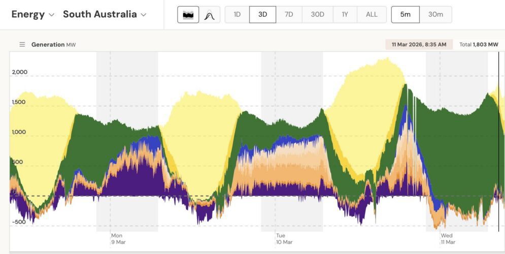Så hanteras överskottet. AEMO gav instruktion till det stora batteriet på Torrens Island att stå i beredskap med låg laddning, redo att börja ladda och därmed suga upp överskottet om det behövdes. Men marknaden löste situationen själv: andra batterier började ladda när elpriset föll till minus 235 dollar per megawattimme – de fick alltså betalt för att ta emot elektricitet. Beredskapsläget avblåstes klockan 14.