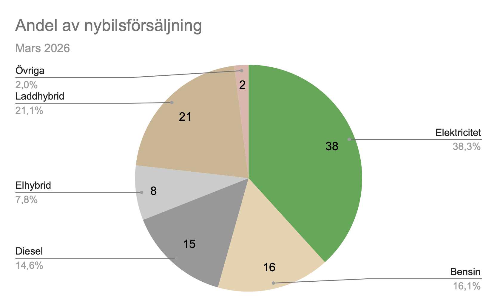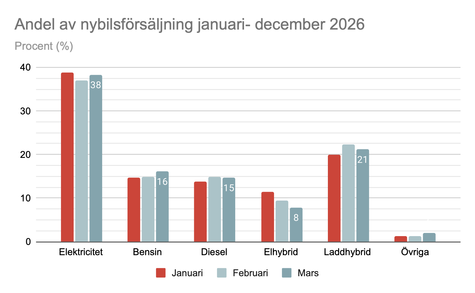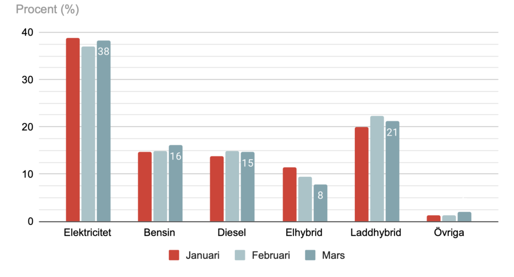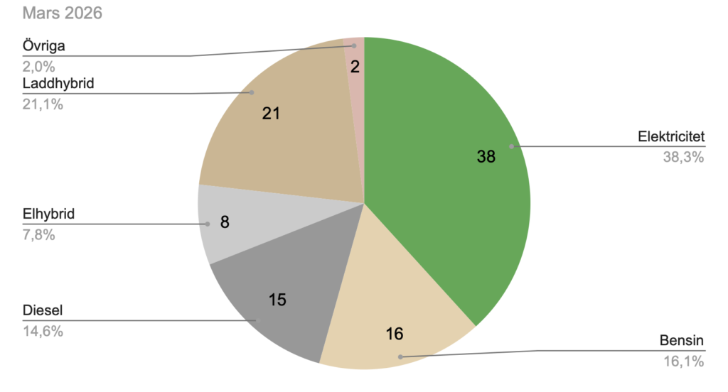 Bränsleslagens andelar av nybilsförsäljning i Sverige mars 2026