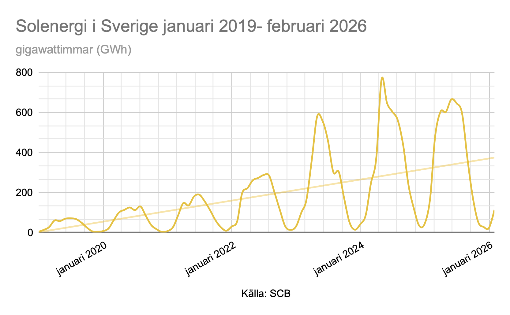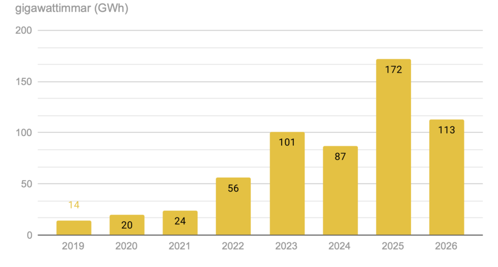 Elproduktion från solenergi i Sverige januari 2019 – februari 2026 (gigawattimmar)