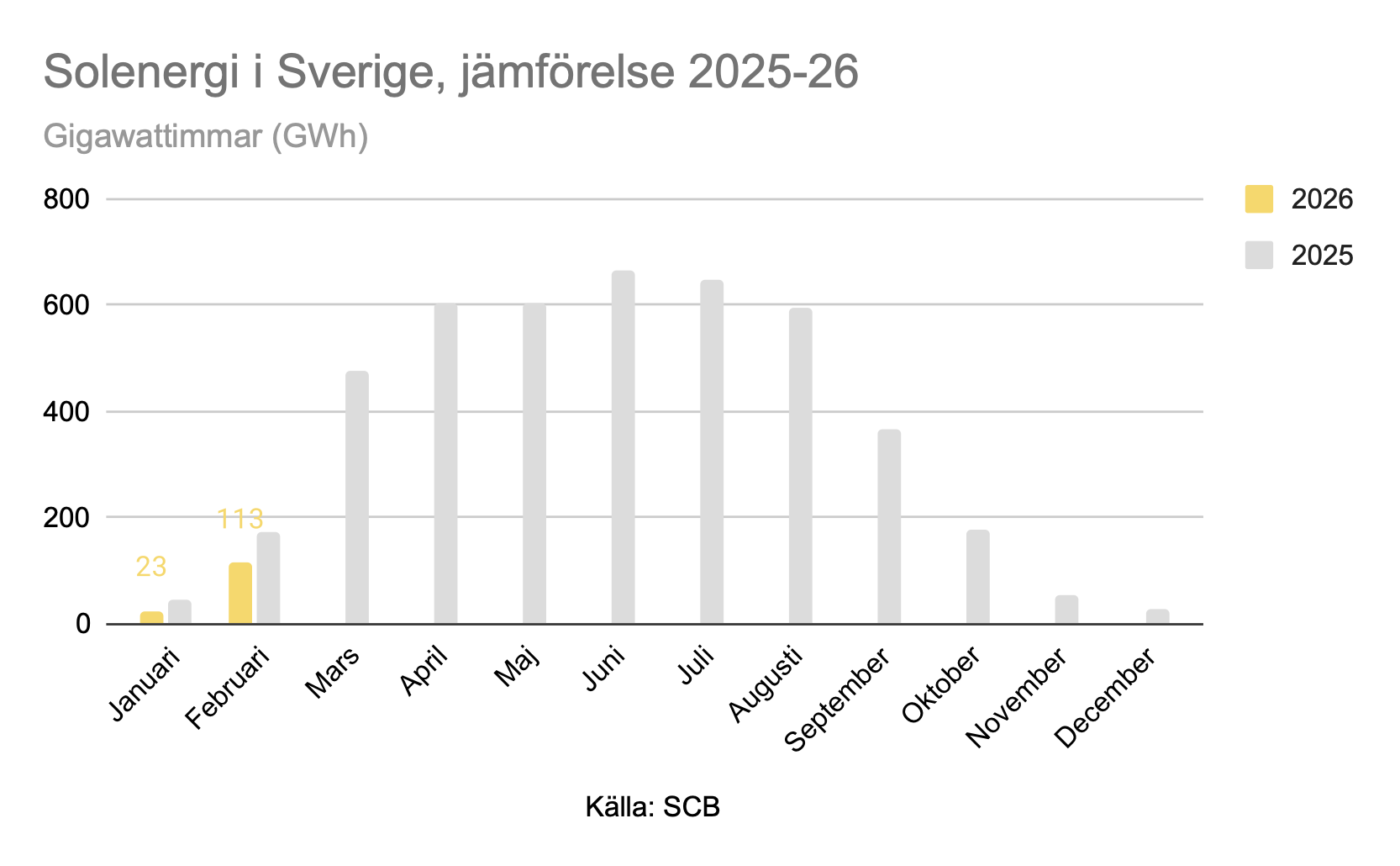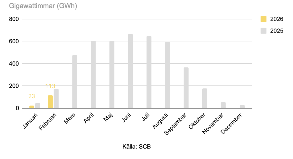 Solenergin i Sverige genererade 113 miljarder wattimmar (gigawatimmar) elektricitet i februari 2026, en minskning med 34 procent från februari 2025.