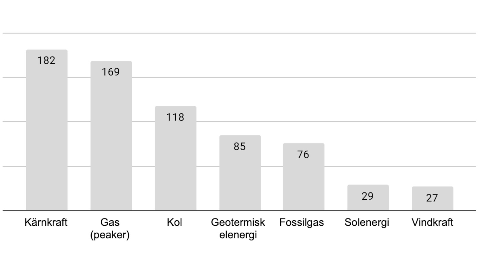 Idag sammanfattar vi den globala prisutvecklingen för olika energislag. Vi har tittat på prisutvecklingen för kärnkraft till geotermisk elenergi, kol, solvärme, fossilgas, peakergas, vindkraft och solenergi. Interaktiv version År Kärnkraft Geotermisk elenergi Kol Solvärme Fossilgas Gas (peaker) Vindkraft Solenergi 2009 123 76 111 168 83 275 135 359 2010 107...